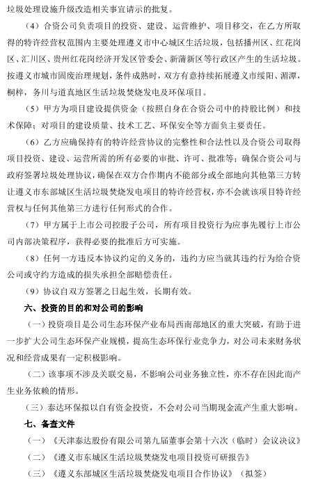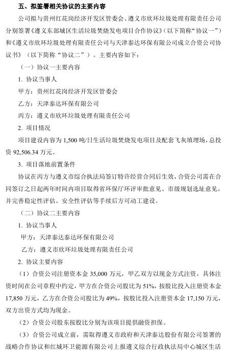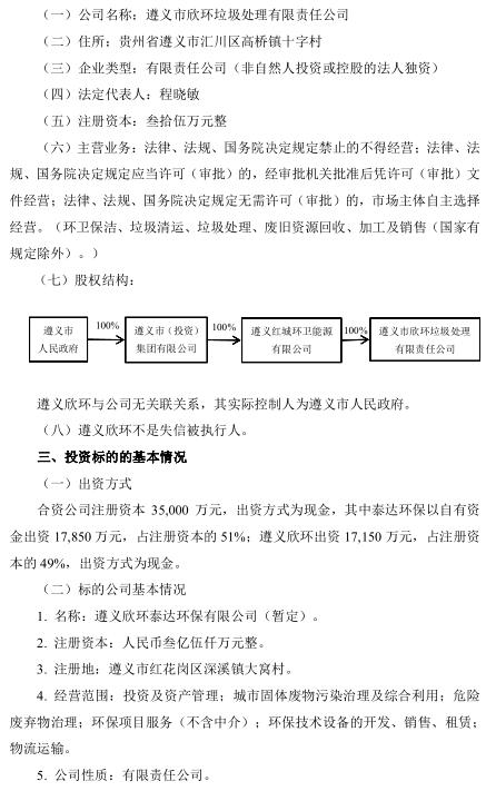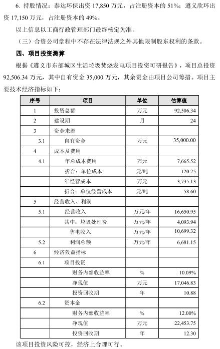 日前,泰達(dá)環(huán)保發(fā)布公告,公司控股子公司天津泰達(dá)環(huán)保有限公司(以下簡稱“泰達(dá)環(huán)?!保M與遵義市欣環(huán)垃圾處理有限責(zé)任公司(以下簡稱“遵義欣環(huán)”)組建合資公司共同投資建設(shè)遵義市東部城區(qū)生活垃圾焚燒發(fā)電項(xiàng)目(以下簡稱“項(xiàng)目”)。項(xiàng)目選址紅花崗區(qū)深溪鎮(zhèn),占地面積約 147 畝,承擔(dān)遵義市中心城區(qū)生活垃圾處理任務(wù)。項(xiàng)目采用 PPP 模式中的 BOT 方式,特許經(jīng)營期限為 30 年(含 2 年建設(shè)期),投資概算為 92,506.34 萬元。合資公司負(fù)責(zé)建設(shè)處理規(guī)模為 1,500 噸/日(預(yù)留 750 噸/日)的生活垃圾焚燒發(fā)電項(xiàng)目和配套飛灰填埋場。合資公司注冊資本為 35,000 萬元,股東方以現(xiàn)金方式出資,其中泰達(dá)環(huán)保出資 17,850 萬元,占注冊資本的 51%;遵義欣環(huán)出資 17,150 萬元,占注冊資本的 49%。