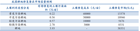 土壤問題具有隱蔽性,輿論媒體關(guān)注低。與大氣污染和水污染不同,土壤污染的表現(xiàn)形式相對(duì)隱蔽。部分土壤污染物從肉眼上并不容易辨別,而部分受污染的土壤又遠(yuǎn)離人們的聚居區(qū),因此導(dǎo)致土壤污染相對(duì)難以得到重視。土壤市場仍未完全釋放,但潛在市場巨大,預(yù)計(jì)十三五期間將引來第一波土壤修復(fù)高潮,市場潛力在3000億左右。