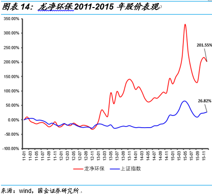 龍凈環(huán)保依靠其SCR煙氣脫硝技術(shù)將圓盤回旋混流技術(shù)與AIG氨噴射技術(shù)進(jìn)行有機(jī)結(jié)合,可保證氨/煙氣混合更加均勻;氨氣流量調(diào)節(jié)采用氣動(dòng)薄膜單座直通式調(diào)節(jié)閥組來實(shí)現(xiàn),具有線性調(diào)節(jié)性好、反應(yīng)動(dòng)作快、調(diào)節(jié)穩(wěn)定、密封性能好等優(yōu)點(diǎn),既可保證高脫硝率,又能準(zhǔn)確控制氨流量,保證氨逃逸率。采用該先進(jìn)技術(shù),可保證脫硝率達(dá)90%以上,氨逃逸<2.5ppm,SO2/SO3轉(zhuǎn)化率<1%。在2015年中電聯(lián)公布的簽訂合同的火電廠煙氣脫硝機(jī)組容量情況中,龍凈環(huán)保排名全國第二。隨著脫硝市場(chǎng)的快速釋放和業(yè)績的增加,公司股價(jià)從2011年初到2015年底上漲201.55%,跑贏上證指數(shù)175個(gè)百分點(diǎn),公司市值也由2011年初的71.5億增加至2015年底的185億。