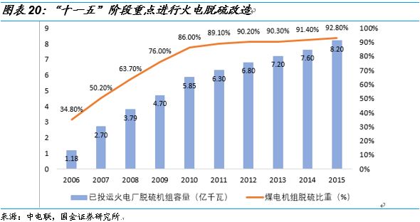 例如火電脫硫脫硝超低排放呈現(xiàn)階段性并進(jìn)入了成熟期,在“十一五”期間重點(diǎn)進(jìn)行全國煤電機(jī)組脫硫改造,全國煤電機(jī)組脫硫機(jī)組占比從2006年的34.80%快速提升至2010年的86%?!笆濉敝攸c(diǎn)進(jìn)行了煤電脫硝改造,全國煤電機(jī)組脫硝比重從2011年的9.80%快速增長到了2015年的95%。“十三五”期間重點(diǎn)進(jìn)行了超低排放改造,截止2017年底,全國范圍內(nèi)超低排放改造目標(biāo)任務(wù)完成率已達(dá)71%,東部地區(qū)已基本完成,部分中部地區(qū)省份也提前完成了改造任務(wù),預(yù)計(jì)2020年全國將全部火電超低排放改造。