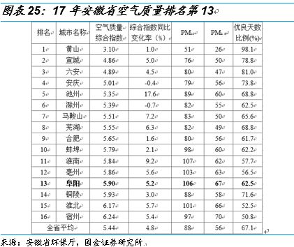 我們以阜陽市為例,2017年大氣污染防治工作考核不合格。2018年3月6日,安徽省政府辦公廳公布2017年度大氣污染防治工作考核結(jié)果。黃山市、合肥市為優(yōu)秀等次,池州市、阜陽市、淮南市、亳州市為不合格等次??己瞬缓细竦乃某鞘袑⒚媾R環(huán)評(píng)限批,即新增大氣污染物排放建設(shè)項(xiàng)目將被暫停審批。