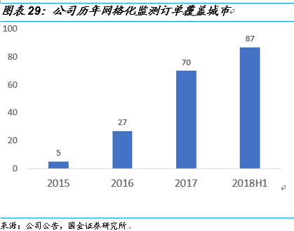 網(wǎng)格化監(jiān)測(cè)系統(tǒng)有望成為城市空氣治理之標(biāo)配。在國家生態(tài)環(huán)境部開展城市空氣質(zhì)量排名的考核排名壓力下,部分省市開始將空氣質(zhì)量考核排名下沉到對(duì)鄉(xiāng)鎮(zhèn)空氣質(zhì)量考核,進(jìn)而開始建設(shè)鄉(xiāng)鎮(zhèn)站空氣監(jiān)測(cè)項(xiàng)目,2018年上半年公司陸續(xù)中標(biāo)河南鶴壁,山東菏澤,河北保定、唐山及張家口等地鄉(xiāng)鎮(zhèn)站空氣監(jiān)測(cè)建設(shè)項(xiàng)目。我們認(rèn)為隨著城市空氣質(zhì)量排名從地級(jí)市下沉到縣級(jí)市,并且環(huán)保督察的持續(xù)高壓,網(wǎng)格化監(jiān)測(cè)有望成為城市空氣治理的標(biāo)配。