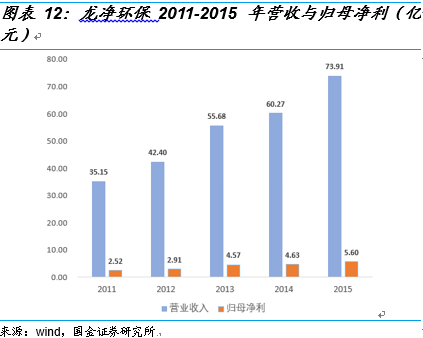 政策的大力支持帶動(dòng)了火電脫硝機(jī)組的快速增長,全國煤電機(jī)組脫硝比重從2011年的9.80%快速增長到了2015年的95%。與此同時(shí),脫硝機(jī)組的改造帶動(dòng)了相應(yīng)市場(chǎng)需求的快速釋放,從事大氣污染控制領(lǐng)域的上市公司龍凈環(huán)保的營業(yè)收入和歸母凈利從2011年的35.15億和2.52億,快速增長到了2015年的73.91億和5.60億,復(fù)合增長率分別達(dá)到了20.42%和22.10%。