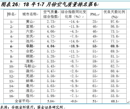 截至8月14日,阜陽市空氣質(zhì)量綜合指數(shù)由去年同期的第13名上升至第6名;PM2.5平均濃度51微克/立方米,較去年同期下降25.0%,降幅居全省第2位;優(yōu)良天數(shù)156天,同比增加27天。在生態(tài)環(huán)境部發(fā)布的2018年上半年全國空氣質(zhì)量狀況通報(bào)中,阜陽空氣質(zhì)量改善幅度居全國169個(gè)城市第5位。