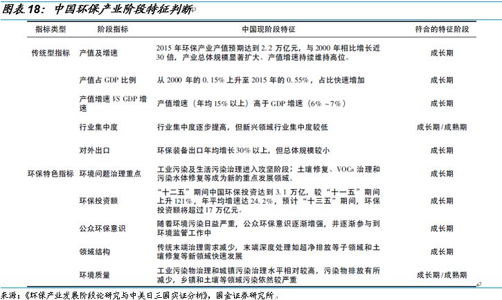 環(huán)保行業(yè)具有逆周期性和階段性,我國環(huán)保行業(yè)正處于成長期。環(huán)保行業(yè)發(fā)展的前提是經(jīng)濟(jì)高速增長帶來的資源耗損和污染積累,這使環(huán)保行業(yè)形成與發(fā)展上滯后于經(jīng)濟(jì)的快速發(fā)展期。當(dāng)經(jīng)濟(jì)增長向中高速發(fā)展甚至下滑時(shí),之前經(jīng)濟(jì)高速發(fā)展所掩蓋的資源環(huán)境問題開始凸顯并受到重視。另外在經(jīng)濟(jì)衰退過程中,政府還將依靠財(cái)政投資來拉動(dòng)低迷的經(jīng)濟(jì)增長。此時(shí),具有基礎(chǔ)設(shè)施建設(shè)內(nèi)容、與國民經(jīng)濟(jì)其他部門關(guān)聯(lián)性強(qiáng)、具有綜合效益的環(huán)保產(chǎn)業(yè)也將得到大量的資金投入,帶動(dòng)其快速發(fā)展。因此環(huán)保產(chǎn)業(yè)的形成與發(fā)展具有較強(qiáng)的逆經(jīng)濟(jì)周期性。我國環(huán)保產(chǎn)業(yè)發(fā)展正處于成長期向成熟期的邁進(jìn)的重要階段,在中長期內(nèi)仍有較大的發(fā)展空間和潛力。