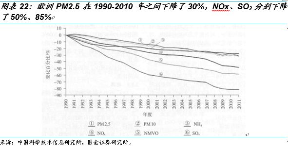 我們對(duì)比歐洲幾十年的治理之路,1952年倫敦?zé)熿F事件后開始大氣治理。1975年倫敦的霧霾天氣由每年幾十天減少到了15天,1980 年降到5天。整個(gè)歐洲的PM2.5的排放量從1990年到2010年的20年間下降了30%?!洞蜈A藍(lán)天保衛(wèi)戰(zhàn)三年行動(dòng)計(jì)劃》要求5年間PM2.5未達(dá)標(biāo)地級(jí)及以上城市濃度比2015年下降18%以上,即使我國有集中力量辦大事的優(yōu)勢(shì),但空氣改善任務(wù)依然艱巨,時(shí)間緊任務(wù)重。