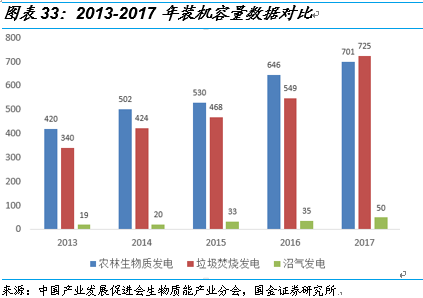 2017 年,垃圾焚燒發(fā)電裝機(jī)容量達(dá)725.1萬千瓦,較上年增長32.1%;農(nóng)林生物質(zhì)發(fā)電裝機(jī)容量達(dá)700.77萬千瓦,較上年增長8.4%;沼氣發(fā)電裝機(jī)容量達(dá)49.9萬千瓦,較上年增長42.9%。2017 年,垃圾焚燒發(fā)電裝機(jī)容量增長速度快于農(nóng)林生物質(zhì)裝機(jī)容量增速,垃圾發(fā)電裝機(jī)容量5 年內(nèi)首次超過農(nóng)林生物質(zhì)發(fā)電裝機(jī)容量。