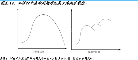 常杪在《環(huán)保產(chǎn)業(yè)發(fā)展階段論研究與中美日三國實(shí)證分析》提出,環(huán)保產(chǎn)業(yè)的生命周期形態(tài)屬于周期擴(kuò)展型,即隨著環(huán)保產(chǎn)業(yè)的發(fā)展和環(huán)境質(zhì)量的改善,環(huán)保產(chǎn)業(yè)發(fā)展重心將根據(jù)需求的變化而發(fā)生改變,進(jìn)而帶來新的周期性發(fā)展。