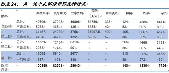 民眾參與程度提高、處罰企業(yè)力度加大、問責(zé)官員數(shù)量增多。3月29日,在生態(tài)環(huán)境部3月份例行新聞發(fā)布會(huì)上,生態(tài)環(huán)境部新聞發(fā)言人劉友賓表示第一輪中央環(huán)保督察共問責(zé)黨政領(lǐng)導(dǎo)干部1.8萬余人,受理群眾環(huán)境舉報(bào)13.5萬件,直接推動(dòng)解決群眾身邊的環(huán)境問題8萬多個(gè)。隨著中央環(huán)保督察的追批次展開,民眾參與程度更高、處罰企業(yè)力度更大、問責(zé)官員數(shù)量更多。第四批督察辦結(jié)群眾舉報(bào)案件40706件,遠(yuǎn)高于前三批的13095件、15631件和31457件,群眾的參與度高體現(xiàn)了對(duì)中央環(huán)保督察的認(rèn)可和擁護(hù)。問責(zé)官員數(shù)量更多,主要體現(xiàn)在約談人數(shù)和問責(zé)人數(shù)。特別是第四批督察的問責(zé)人數(shù)的總數(shù)和每省平均人數(shù)為6471人和809人,均創(chuàng)四批督察的新高。