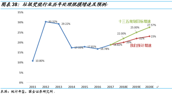 其次,雖然我國垃圾焚燒處理率提高迅速,但跟規(guī)劃仍有較大差距。我國的垃圾焚燒行業(yè)在“十二五”經(jīng)歷了快速增長,垃圾焚燒處理率從2011年的18%迅速提升到了2016年的38%。《“十三五”全國城鎮(zhèn)生活垃圾無害化處理設(shè)施建設(shè)規(guī)劃》提出,“十三五”期間,全國規(guī)劃新增生活垃圾無害化處理能力50.97萬噸/日(包含“十二五”續(xù)建12.9 萬噸/日),其中垃圾焚燒處理設(shè)施規(guī)模2020年要達(dá)到59.14萬噸/日。2017年的總處理能力達(dá)到30.4萬噸/日,要完成2020年的目標(biāo),2018-2020三年的行業(yè)復(fù)合增長率要達(dá)到24.83%。根據(jù)行業(yè)歷年增速及現(xiàn)有公司在建及籌建規(guī)模,我們預(yù)計(jì)2018-2020年行業(yè)增速分別是20%、22%和23%。