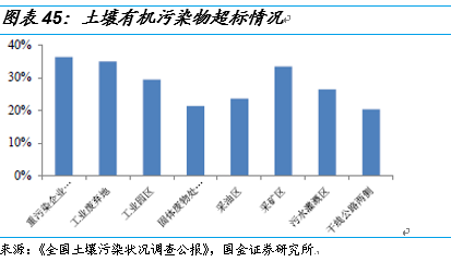 除了耕地污染,我國場(chǎng)地污染情況也很嚴(yán)重。全國土壤污染狀況調(diào)研公報(bào)中,重污染企業(yè)、工業(yè)廢棄地和工業(yè)園區(qū)的有機(jī)污染超標(biāo)均達(dá)到和超過了30%。隨著我國城鎮(zhèn)化率的提高和城市建設(shè)面積的擴(kuò)大,很多重污染企業(yè)需要搬離城區(qū),這將產(chǎn)生很大的場(chǎng)地修復(fù)需求。