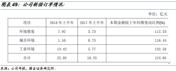 今年以來,公司項(xiàng)目拓展速度明顯加速,上半年公司三大業(yè)務(wù)板塊環(huán)境修復(fù)、城市環(huán)境和工業(yè)環(huán)境的新增訂單增速分別是112%、116%和133%,總金額達(dá)到了22.92億元。18年上半年,公司環(huán)境修復(fù)板塊實(shí)現(xiàn)收入4.28億元,同比增長64.29%。