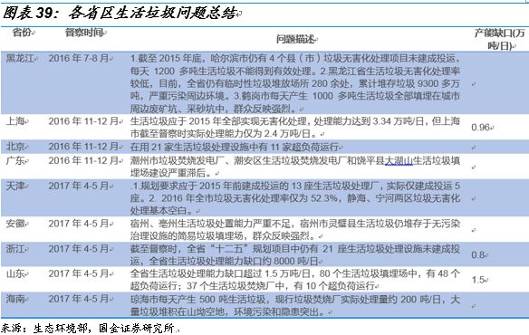 最后,我們通過生態(tài)環(huán)境部網(wǎng)站中的2016年到2017年的中央環(huán)保督察對(duì)全國31省區(qū)的督察反饋中發(fā)現(xiàn),垃圾焚燒產(chǎn)能的缺口確實(shí)存在且巨大。在31個(gè)省區(qū)中,其中有9個(gè)省區(qū)被督察到有生活垃圾無害化能力不足的問題。例如:浙江省督察時(shí)發(fā)現(xiàn)全省“十二五”規(guī)劃項(xiàng)目中仍有21座生活垃圾處理設(shè)施未建成投運(yùn),全省生活垃圾處理能力缺口約8000噸/日;山東省全省生活垃圾處理能力缺口超過1.5萬噸/日,80個(gè)生活垃圾填埋場(chǎng)中,有48個(gè)超負(fù)荷運(yùn)行。