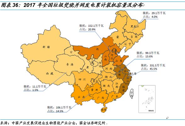 2017年底,我國垃圾焚燒累計(jì)并網(wǎng)發(fā)電裝機(jī)容量達(dá)到725.1萬千瓦,約占全國生物質(zhì)并網(wǎng)發(fā)電總裝機(jī)容量的49%。隨著我國城鎮(zhèn)化建設(shè)進(jìn)一步深入,垃圾焚燒發(fā)電項(xiàng)目開發(fā)建設(shè)重點(diǎn)已經(jīng)逐步由大中型城市向新興城鎮(zhèn)轉(zhuǎn)移,“十三五”期間的垃圾焚燒發(fā)電將是生物質(zhì)發(fā)電產(chǎn)業(yè)中的主要增長點(diǎn)。我國的垃圾焚燒發(fā)電項(xiàng)目主要集中在華東和華北地區(qū),尤以經(jīng)濟(jì)相對(duì)發(fā)達(dá)的華東地區(qū)的發(fā)展規(guī)模最大,在全國垃圾焚燒發(fā)電裝機(jī)容量中的占比接近一半。目前,垃圾焚燒發(fā)電累計(jì)裝機(jī)容量占全國比例最高的四個(gè)地區(qū)分別為:江蘇、廣東、浙江和山東,垃圾焚燒發(fā)電項(xiàng)目的建設(shè)與地區(qū)經(jīng)濟(jì)的發(fā)展密切相關(guān)。