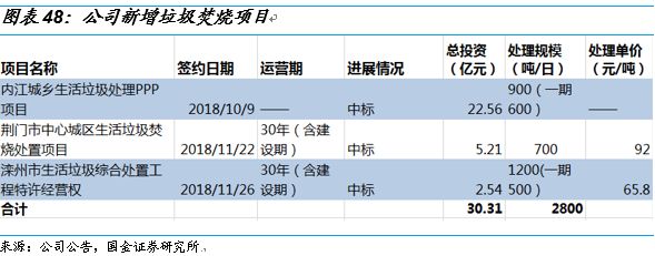 固廢處理在手項(xiàng)目充足,未來業(yè)績?cè)鲩L有保障。公司固廢處理業(yè)務(wù)板塊已經(jīng)投運(yùn)產(chǎn)能11300噸/日,在建及籌建產(chǎn)能約為16000噸/日,在手項(xiàng)目充足,未來產(chǎn)能還有翻倍的空間。我們預(yù)計(jì)2019年將投產(chǎn)3700噸/日,2020年將投產(chǎn)3000噸/日以上。11月21日,公司以3.7億元收購贛州宏華環(huán)保有限責(zé)任公司100%股權(quán),并投資贛州信豐工業(yè)固體廢物處置中心項(xiàng)目。信豐項(xiàng)目危險(xiǎn)廢物處置規(guī)模為7.2萬噸/年,其中填埋4.8萬噸/年、焚燒1.5萬噸/年、物化處理0.2萬噸/年、廢鋼制包裝桶回收0.7萬噸/年,安全填埋場(chǎng)總庫容95萬m³,預(yù)計(jì)于18年12月底正式投入運(yùn)營。公司原有危廢處置項(xiàng)目為佛山市南海區(qū)項(xiàng)目(9.3萬噸/年),目前在建中。通過收購宏華環(huán)保100%股權(quán),公司危廢處置規(guī)模達(dá)到16.5萬噸。此次收購有利于實(shí)現(xiàn)公司的危廢業(yè)務(wù)戰(zhàn)略布局,符合公司戰(zhàn)略投資方向和業(yè)務(wù)發(fā)展規(guī)劃,將為公司創(chuàng)造新的利潤增長點(diǎn)。