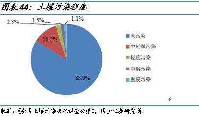 根據(jù)國土資源部數(shù)據(jù),最新全國耕地面積為 20.27 億畝。全國土壤污染狀況調(diào)查公報(bào)中,全國土壤總的超標(biāo)率為 16.1%;耕地土壤點(diǎn)位超標(biāo)率為 19.4%,其中輕微、輕度、中度和重度污染點(diǎn)位比例分別為 13.7%、 2.8%、 1.8%和 1.1%,其中重度、中度污染耕地區(qū)域面積高達(dá) 5878 萬畝。