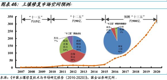 我們預(yù)計(jì)目前我國每年的土壤修復(fù)市場(chǎng)在150-200億之間,根據(jù)《中國土壤修復(fù)技術(shù)與市場(chǎng)研究報(bào)告(2016-2020)》的預(yù)測(cè),“十三五”期間,我國土壤修復(fù)市場(chǎng)空間將達(dá)到900億,發(fā)展階段將進(jìn)入快速成長期。