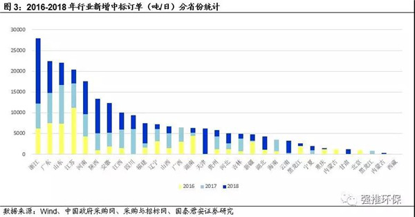 2016-2018年,浙江、廣東、山東、江蘇為新增項(xiàng)目最多的前四個(gè)省份,新中標(biāo)項(xiàng)目分別達(dá)到了2.8、2.2、2.2、2萬(wàn)噸/日的規(guī)模,這還不包括部分未經(jīng)過(guò)招標(biāo)程序的擴(kuò)建項(xiàng)目。