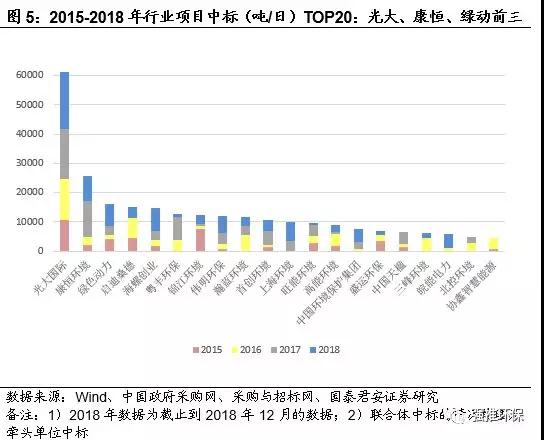 分公司來(lái)看,2015-2018年行業(yè)新增項(xiàng)目總產(chǎn)能前三的公司分別為光大國(guó)際、康恒環(huán)境、綠色動(dòng)力,分別占有新增中標(biāo)項(xiàng)目總量的22%、9%、6%。