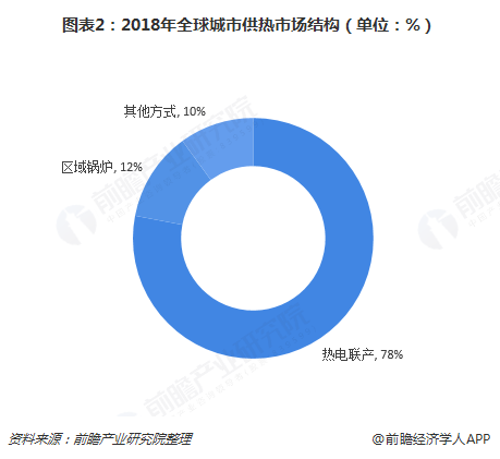 在城市供熱領域,熱電聯(lián)產也占據(jù)著重要地位。2018年,在全球城市供熱市場結構中,熱電聯(lián)產供熱占比接近八成,約為78%,遠高于區(qū)域鍋爐12%的比重。