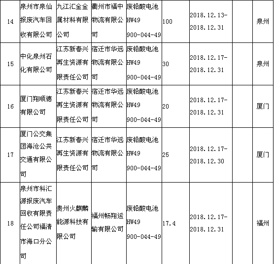 日前福建省環(huán)境保護廳發(fā)布了《2018年12月福建省危險廢物跨省轉(zhuǎn)移情況公告》,共有24項,具體內(nèi)容如下: