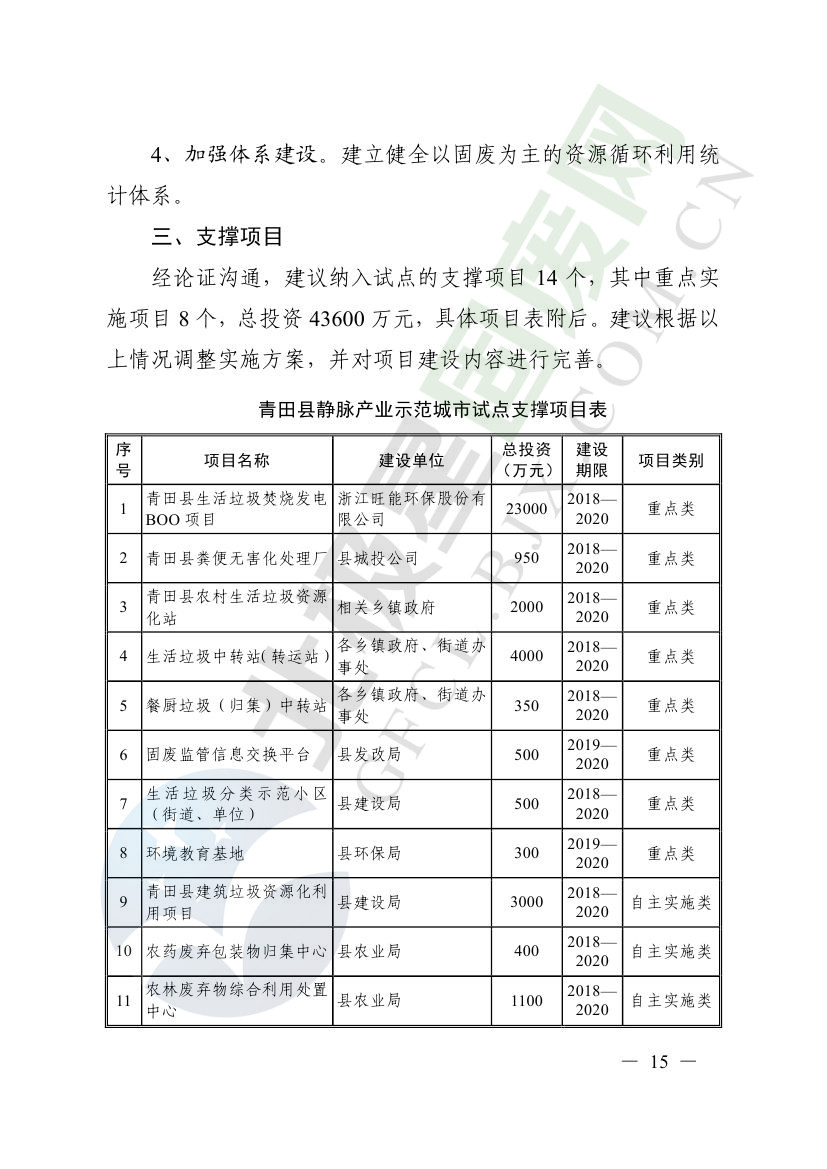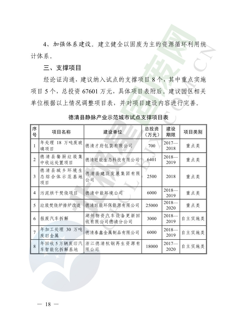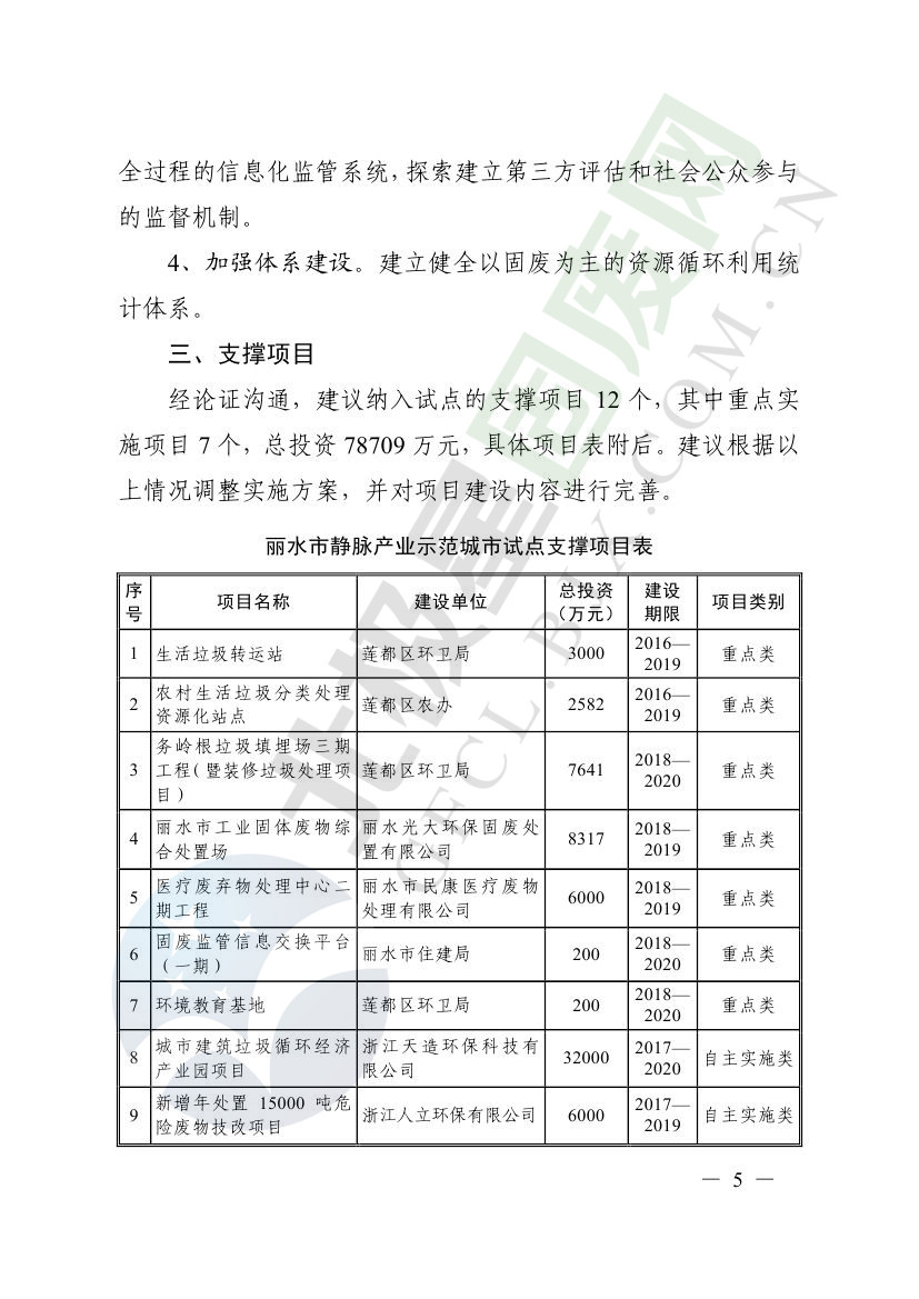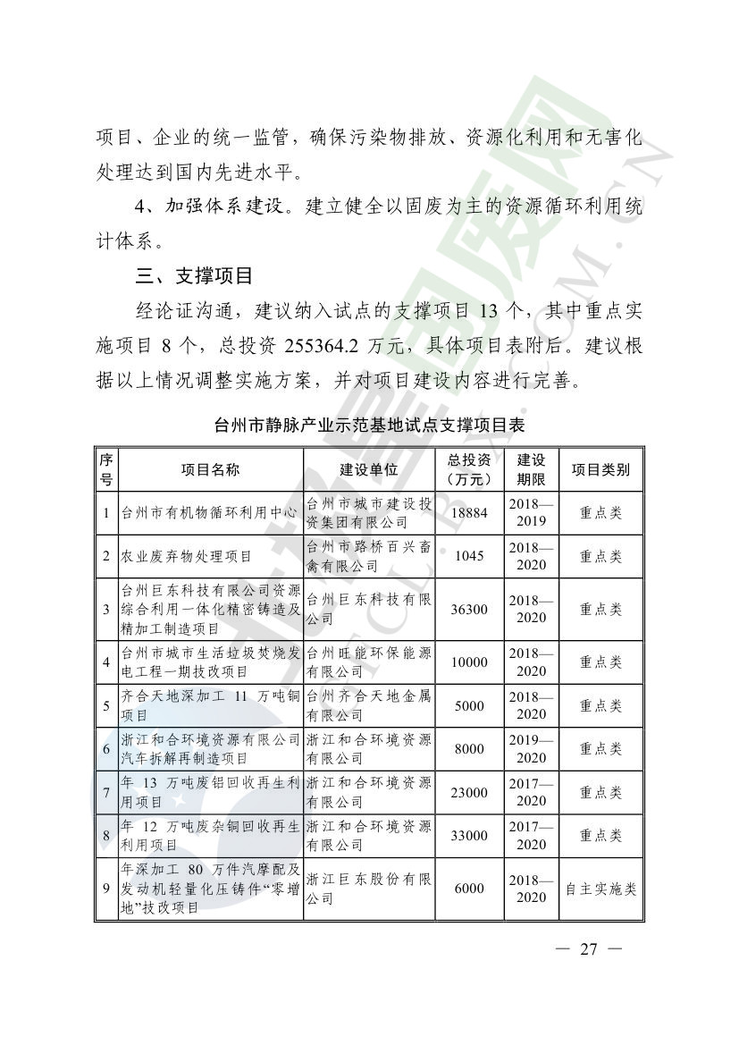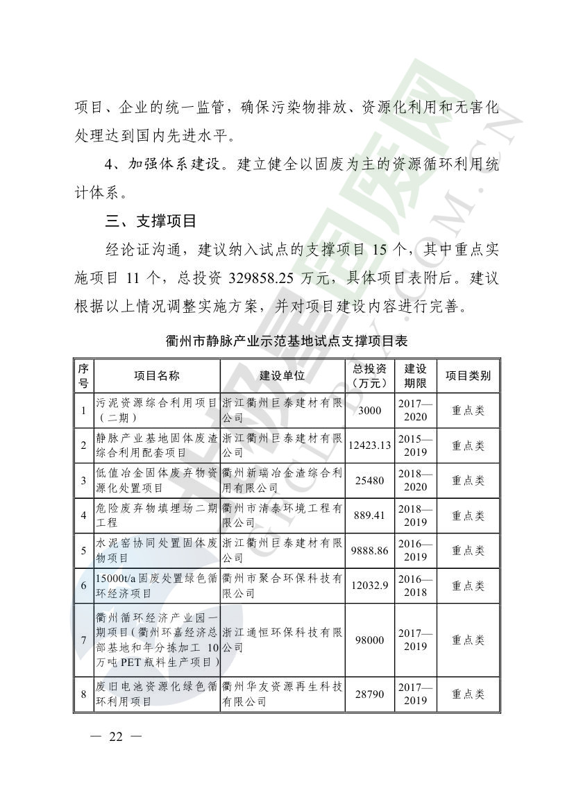 一、原則同意麗水市等8個城市和衢州市等3個基地的試點實施方案,并確定麗水市等4個城市為省級靜脈產(chǎn)業(yè)示范城市試點(創(chuàng)建類),衢州市等2個基地為省級靜脈產(chǎn)業(yè)示范基地試點(創(chuàng)建類),金華市等4個城市為省級靜脈產(chǎn)業(yè)示范城市試點(培育類),臺州市為省級靜脈產(chǎn)業(yè)示范基地試點(培育類),具體名單詳見附件1。請根據(jù)意見(附件2)認(rèn)真修改完善試點方案,于12月22日前將修改完善后的實施方案(附光盤)(一式2份)報送省發(fā)展改革委、省財政廳、省生態(tài)環(huán)境廳、省建設(shè)廳、省農(nóng)業(yè)農(nóng)村廳、省商務(wù)廳備案。