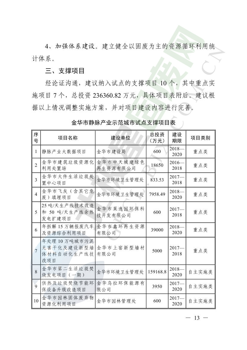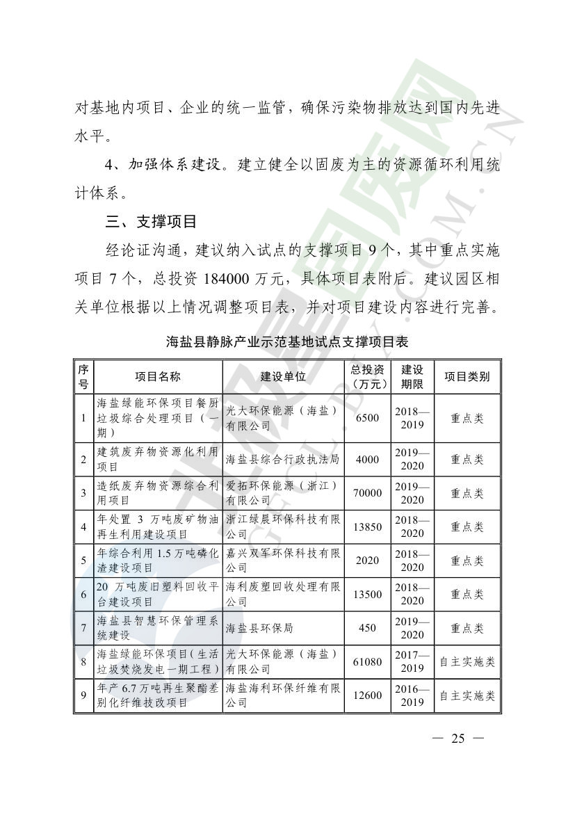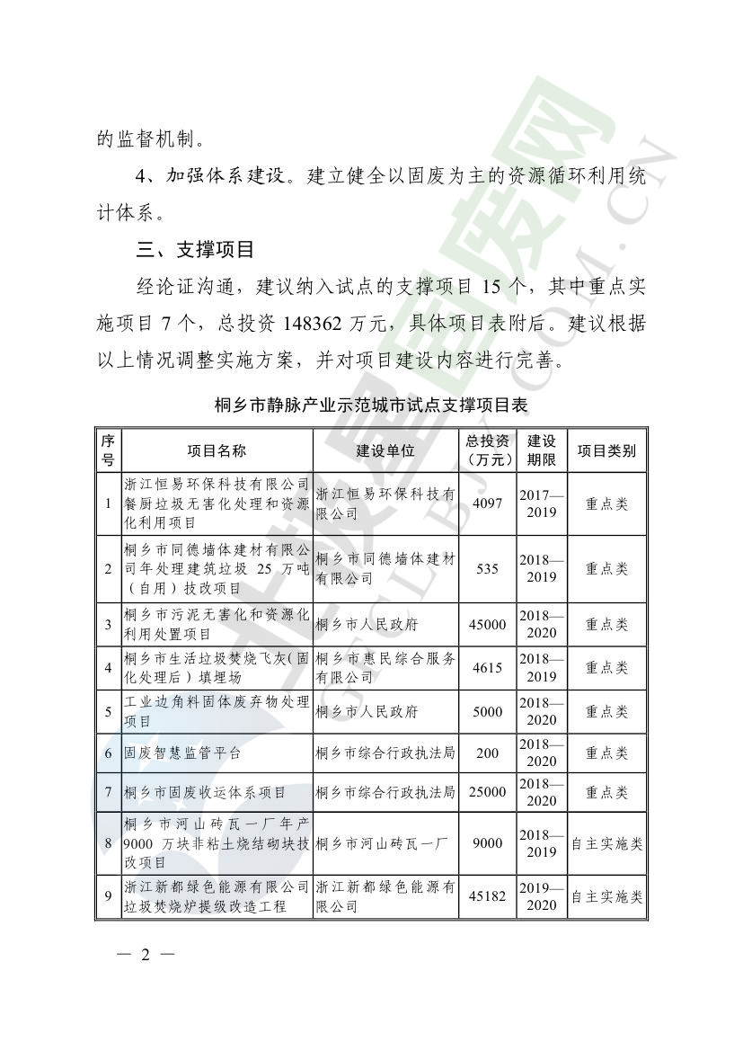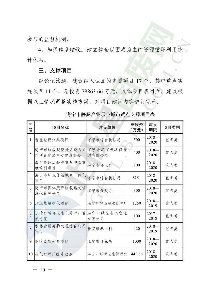 一、原則同意麗水市等8個城市和衢州市等3個基地的試點實施方案,并確定麗水市等4個城市為省級靜脈產(chǎn)業(yè)示范城市試點(創(chuàng)建類),衢州市等2個基地為省級靜脈產(chǎn)業(yè)示范基地試點(創(chuàng)建類),金華市等4個城市為省級靜脈產(chǎn)業(yè)示范城市試點(培育類),臺州市為省級靜脈產(chǎn)業(yè)示范基地試點(培育類),具體名單詳見附件1。請根據(jù)意見(附件2)認(rèn)真修改完善試點方案,于12月22日前將修改完善后的實施方案(附光盤)(一式2份)報送省發(fā)展改革委、省財政廳、省生態(tài)環(huán)境廳、省建設(shè)廳、省農(nóng)業(yè)農(nóng)村廳、省商務(wù)廳備案。