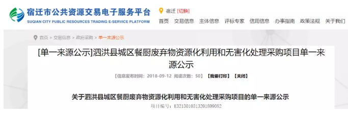 目前(宿城管發(fā)(2018)24號)文件要求,全市餐廚廢棄物處理(PPP)項(xiàng)目已由中國光大國際有限公司中標(biāo)承建,其中二期工程2019年后才能覆蓋到我縣,針對我縣餐廚現(xiàn)狀及城管局核算,運(yùn)送到市里統(tǒng)一處理成本低(與市區(qū)同價)操作可行。該公司具有該項(xiàng)目環(huán)??萍汲晒b定證書,且省市領(lǐng)導(dǎo)均建議由該公司統(tǒng)一處理全市餐廚廢棄物。故我縣餐廚廢棄物送中國光大國際有限公司(光大環(huán)保餐廚處理宿遷有限公司)處理,符合單一來源要求。