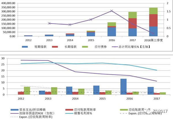 截至2018年第三季度,公司在建工程賬面余額約406,115萬元,是同期固定資產(chǎn)賬面價值的53倍,主要通過PPP業(yè)務模式開展。隨著業(yè)務擴張,近幾年公司的資本支出水平明顯, 2016年的資本支出/折舊攤銷高達13,同期的負債水平也明顯上升。2017年公司加大長期借款額度,長期負債占比上升至32,同比增加約50%。但企業(yè)的營運資金效率水平欠缺,自2016年,長期債務/營運資金比例明顯增加,2017年比值接近202,償債壓力顯現(xiàn)。而2015-2017年企業(yè)的經(jīng)營現(xiàn)金流凈額呈現(xiàn)負值,盈利空間下滑,而2016、2017的應收賬款占比在50%以上,且回款率有所降低,壞賬風險增加。基于此,公司未來的產(chǎn)能釋放和成本控制將對公司可持續(xù)經(jīng)營起到關(guān)鍵作用。2017年年報顯示公司的多個項目已經(jīng)完工轉(zhuǎn)入固定資產(chǎn),2018-2019年將開始投產(chǎn)。某種程度上和公司的組織調(diào)整相呼應。