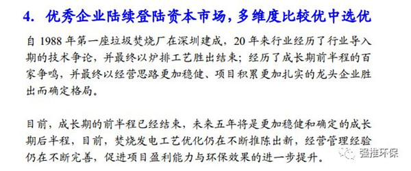 更加穩(wěn)健的成長期后半程:行業(yè)經(jīng)歷20年發(fā)展,導(dǎo)入期的技術(shù)爭論,最終以爐排工藝勝出結(jié)束;成長期前半程的百家爭鳴,最終以經(jīng)營思路穩(wěn)健、項目積累扎實的龍頭企業(yè)勝出而確定格局。未來五年將是更加穩(wěn)健和確定的成長期后半程,以儲備產(chǎn)能釋放為主線,焚燒發(fā)電工藝不斷優(yōu)化,管理經(jīng)驗仍在不斷完善,促進(jìn)項目盈利能力與環(huán)保效果的進(jìn)一步提升。