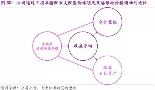 價(jià)格領(lǐng)袖是指經(jīng)由同業(yè)的龍頭公司現(xiàn)行制定產(chǎn)品某一期間內(nèi)的價(jià)格后,其它公司根據(jù)制定的價(jià)格,就其同質(zhì)產(chǎn)品確定其價(jià)格。行業(yè)的競爭對(duì)手如果期望維持已有的市場份額,只能與領(lǐng)先公司制定的價(jià)格相匹配。WM在通過兼并收購占據(jù)統(tǒng)治性的市場份額后,利用龍頭地位果斷選擇了支配型價(jià)格領(lǐng)先策略,進(jìn)一步通過“收益導(dǎo)向策略”、“合并重組”、“剝離不良資產(chǎn)”這三項(xiàng)舉措的實(shí)施維持其價(jià)格領(lǐng)袖的地位。
