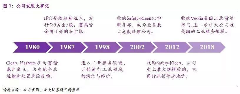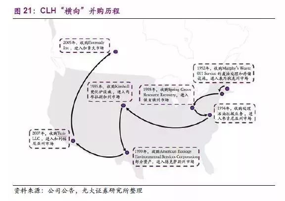 公司于1980年在馬薩諸塞州成立,1989年通過收購工業(yè)廢水處理公司Chem Clear Inc. 確立了CLH 作為垃圾處理供應(yīng)商的地位。1992-1995年,公司先后收購Murphys Waste 011 Service 的廢油處理和存儲(chǔ)設(shè)施、SpringGrove Resource Recovery、處理石油垃圾業(yè)務(wù)、Kimball 焚化爐設(shè)施,逐步進(jìn)入康乃狄克州市場(chǎng)、俄亥俄州市場(chǎng)、弗吉尼亞州市場(chǎng)、內(nèi)布拉斯加州市場(chǎng),將公司從東海岸發(fā)展到中部。1999年和2007年,公司先后收購AmericanEcology Environmental Services Corporation 部分資產(chǎn)、Teris LLC,進(jìn)入德克薩斯州市場(chǎng)及加利福尼亞市場(chǎng),將業(yè)務(wù)拓展到西部。2009年,公司收購從事工業(yè)維護(hù)和生產(chǎn)、住宿和地震服務(wù)的加拿大公司Eveready,此次收購增加了2,100多名員工,79個(gè)地點(diǎn)和2400多輛卡車和拖車單元的服務(wù)車隊(duì),將業(yè)務(wù)拓展到加拿大,公司正式進(jìn)軍海外市場(chǎng)。此外,公司2002年收購 Safety-Kleen化學(xué)服務(wù)部,為公司增加了 55個(gè)服務(wù)中心、33個(gè)廢物管理設(shè)施、4400名員工,大大擴(kuò)展了公司的化學(xué)和廢物處理服務(wù),提升了核心競爭力。