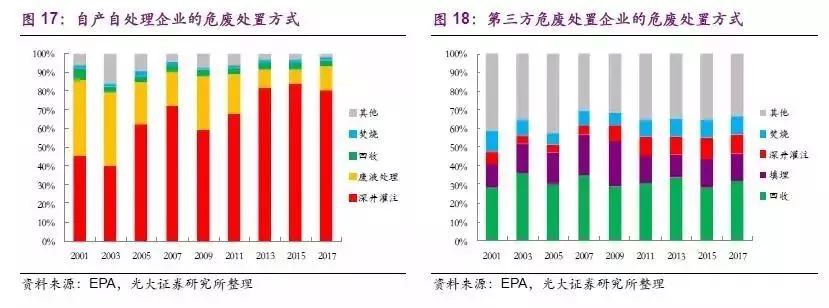 (3)危廢處置方式求同存異。整體來看,美國危廢處置方式的選擇已基本統(tǒng)一,深井灌注已成為美國危廢處置的主流方式,自2013年深井灌注處置危廢量的占比穩(wěn)定在70%左右,廢液處理(僅適用于液費(fèi))、能量回收、焚燒、填埋位列2-5 位。但是另一方面,第三方處置和自產(chǎn)自處理的危廢處置方式有著較大的不同。石油、化工等大型企業(yè)多使用深井灌注處理自己產(chǎn)出的危廢(占比達(dá)80%以上),因其處置手段安全且成本相對(duì)較低;而第三方處置企業(yè)的主流處置方式則是回收利用(包括能量、金屬、溶劑等,占比近30%),填埋、焚燒、深井灌注等處置方式的占比均在10%左右。處置方式差異化的主要原因是自產(chǎn)自處理企業(yè)多為石油和化工企業(yè),危廢種類多為液費(fèi),深井灌注具有顯著的成本優(yōu)勢(shì);而第三方處置企業(yè)接收的危廢種類更加多樣化,液費(fèi)占比也相對(duì)較低(30%左右),回收、焚燒、填埋等處置方式更符合其成本控制和利益獲取的要求,所以上述處置方式的占比更多。