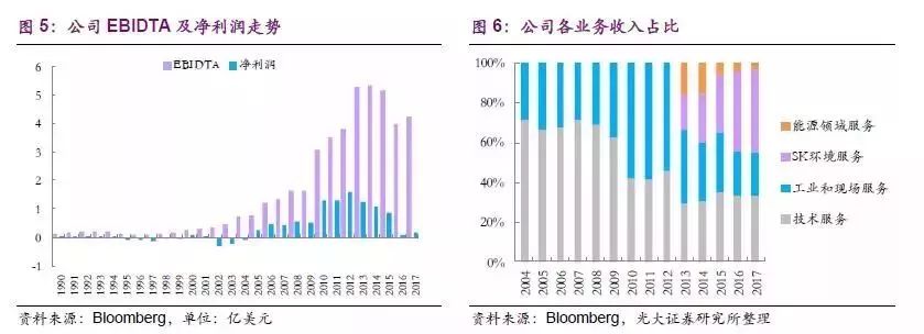 除傳統(tǒng)的技術(shù)服務(wù)之外,公司還提供SK環(huán)境及性能產(chǎn)品服務(wù)、工業(yè)和現(xiàn)場(chǎng)服務(wù)、以及能源領(lǐng)域(石油天然氣和住宿)服務(wù)三大業(yè)務(wù),努力向“一站式服務(wù)”的服務(wù)提供商靠攏。其中,前兩種業(yè)務(wù)和傳統(tǒng)的技術(shù)服務(wù)共同構(gòu)成了公司的核心增長動(dòng)力,三者營業(yè)收入占比高達(dá)96%;而能源領(lǐng)域服務(wù)在未來有望隨著美國頁巖氣革命的發(fā)展給公司帶來新的增量。