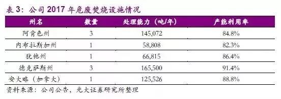 危廢焚燒方面,公司擁有北美共13個(gè)商業(yè)危險(xiǎn)廢物焚化爐中的9個(gè),是北美這類設(shè)施的最大運(yùn)營商。公司垃圾焚燒實(shí)際處理能力為561,721噸,2017年的平均使用率為87.6%。