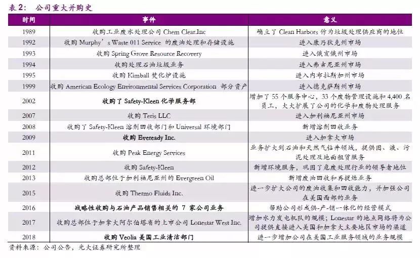 公司上在原有危廢處理技術(shù)的基礎(chǔ)上,通過兼并收購增添一系列新的服務(wù)領(lǐng)域。2008年,公司通過收購Safety-Kleen 溶劑回收部門和Universal 環(huán)境部門,開始涉足溶劑回收市場(chǎng),新增大量業(yè)務(wù)。2009年,公司收購Eveready,在進(jìn)軍加拿大市場(chǎng)的同時(shí),擴(kuò)大了公司能源和工業(yè)服務(wù)范圍。能源和工業(yè)部門為石油和天然氣勘探和生產(chǎn),煉油,石化,紙漿和造紙以及電力公用事業(yè)終端市場(chǎng)等提供一系列服務(wù)。此前,Clean Harbors 在這一領(lǐng)域的傳統(tǒng)業(yè)務(wù)相對(duì)較小,收購Eveready 將公司的能源和工業(yè)服務(wù)收入從3千萬增加到5.5~6億,使其從一個(gè)小眾玩家成長為了市場(chǎng)上該項(xiàng)業(yè)務(wù)強(qiáng)有力的競爭對(duì)手。2011年,公司收購 Peak Energy Services,提供固、液、污泥處理及地面租賃服務(wù),將業(yè)務(wù)擴(kuò)大到石油和天然氣鉆井領(lǐng)域。2012年,公司收購北美領(lǐng)先的廢油回收和再精煉、零件清潔及環(huán)境解決方案公司Safety-Kleen,是公司歷史上最大規(guī)模收購。對(duì)Safety-Kleen的并購使得公司成為北美最大的二手油重磨機(jī)和回收商。此次收購新增了環(huán)境服務(wù)業(yè)務(wù),進(jìn)一步鞏固了公司危廢處理行業(yè)的領(lǐng)導(dǎo)者地位。公司在2013年和2015年相繼收購了總部位于加利福尼亞州的Evergreen Oil 及 Thermo Fluids Inc.,提升公司廢油回收和再精煉能力,進(jìn)一步增強(qiáng)業(yè)務(wù)能力。
