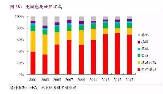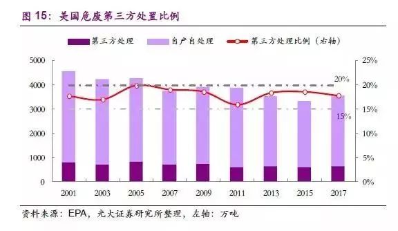 (2)第三方處理比例較低。在1990年后,政府對(duì)危廢的監(jiān)管進(jìn)一步趨嚴(yán),單純的通過第三方處置對(duì)于有大量危廢產(chǎn)出的企業(yè)來說成本過高,加上危廢處理技術(shù)的進(jìn)一步成熟,促使眾多大型化工企業(yè)采用自行處理危廢的方式消納危廢產(chǎn)出。從2001年起,美國危廢的場(chǎng)外處理量(Waste received fromoff-Site,即接收從場(chǎng)外運(yùn)送進(jìn)處理廠內(nèi)的危廢,基本等同于第三方處置量)穩(wěn)定在15%到20%之間,在危廢產(chǎn)量基本穩(wěn)定的情況下,第三方處置危廢企業(yè)可以分到的蛋糕其實(shí)十分有限,這也激發(fā)了危廢處置企業(yè)開拓新業(yè)務(wù)的需求。