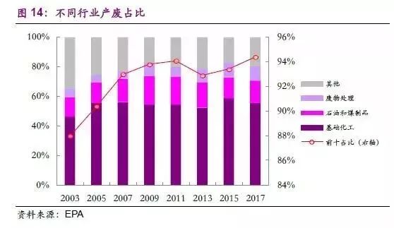(1)危廢行業(yè)較依賴工業(yè),尤其是化工和油氣行業(yè)的發(fā)展。美國不同行業(yè)對(duì)危廢產(chǎn)量的貢獻(xiàn)度上,基礎(chǔ)化工制造業(yè)占比常年超50%,石油和煤制品制造業(yè)以及廢物處理行業(yè)也穩(wěn)居前三,且近20年來,排名前三和前十的行業(yè)的危廢產(chǎn)量占比在穩(wěn)步提高,進(jìn)一步推動(dòng)了行業(yè)集中度的提升。