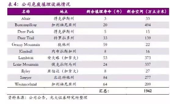 危廢填埋方面,公司在美國和加拿大共擁有11個(gè)活躍的垃圾填埋場(chǎng),其中兩個(gè)是非商業(yè)垃圾填埋場(chǎng),他們只接受來自公司焚化爐的垃圾。其余9個(gè)均為商業(yè)用垃圾填埋場(chǎng),7個(gè)允許用于處置危險(xiǎn)廢物,另2個(gè)用于非處置危險(xiǎn)工業(yè)垃圾處理和城市固體垃圾處理。目前,這些商用垃圾填埋場(chǎng)的仍有約1942萬立方米的剩余容量。