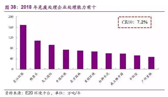 目前我國危廢市場(chǎng)的優(yōu)秀參與者眾多,隨著危廢處理“量價(jià)齊增”的情況延續(xù),從傳統(tǒng)危廢處理企業(yè)東江環(huán)保、光大綠色環(huán)保,到全產(chǎn)業(yè)鏈拓展的大型環(huán)保公司東方園林、北控水務(wù),再到資金實(shí)力雄厚的新興力量海螺創(chuàng)業(yè)、雅居樂,均在危廢行業(yè)持續(xù)開疆拓土。但是,我國的危廢市場(chǎng)行業(yè)集中度仍相對(duì)較低。根據(jù)E20環(huán)境平臺(tái)的統(tǒng)計(jì),雖然我國的危廢企業(yè)處理量快速增長,但是CR10的總產(chǎn)能僅占全國總產(chǎn)能的7.2%,仍有大量的危廢產(chǎn)能被小型企業(yè)所瓜分。