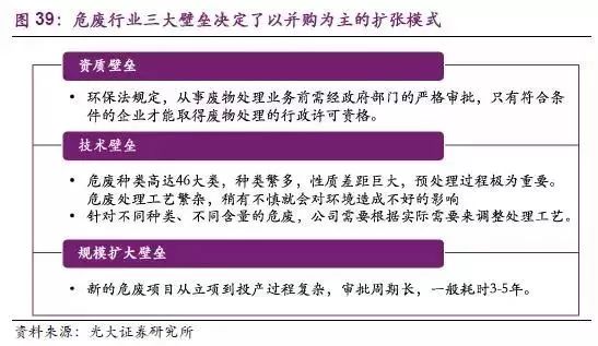 規(guī)模擴(kuò)大壁壘:新的危廢項(xiàng)目從立項(xiàng)到投產(chǎn)過程復(fù)雜,審批周期長,一般耗時(shí)3-5年。顯然,收購有資質(zhì)的企業(yè)會(huì)比新建產(chǎn)能更容易擴(kuò)大企業(yè)規(guī)模。