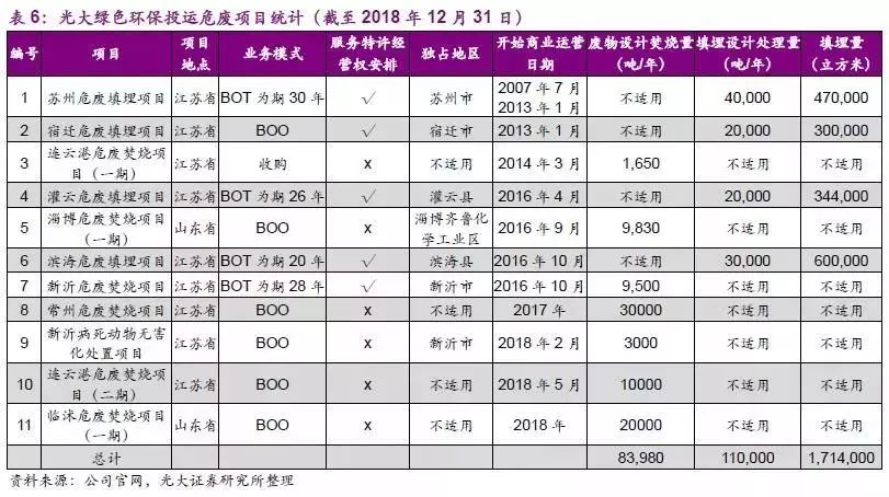 截止2018年12月31日,綠色環(huán)保共擁有58個(gè)生物質(zhì)綜合利用項(xiàng)目(運(yùn)營22個(gè)、在建14個(gè)、籌建13個(gè)、未啟動(dòng)二期項(xiàng)目9個(gè))、32個(gè)危廢綜合處理項(xiàng)目(運(yùn)營11個(gè)、在建4個(gè)、籌建17個(gè))、7個(gè)光伏發(fā)電項(xiàng)目和2個(gè)風(fēng)電項(xiàng)目(均已投運(yùn))、以及9個(gè)環(huán)境修復(fù)項(xiàng)目(運(yùn)營1個(gè)、在建7個(gè)、籌建1個(gè)),總投資共約240億元,年生活垃圾處理產(chǎn)能102萬噸,年危廢處理產(chǎn)能19.4萬噸(焚燒8.4、填埋11),年供熱量96萬噸。