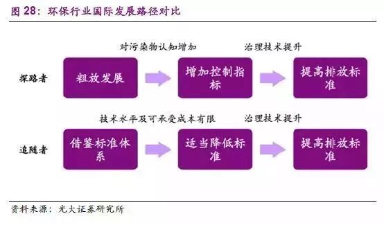 以美國為首的發(fā)達(dá)國家的環(huán)保意識(shí)隨著工業(yè)的大力發(fā)展率先覺醒,開始針對(duì)工業(yè)污染物制定相關(guān)標(biāo)準(zhǔn)。隨著對(duì)污染物的認(rèn)知上升,行業(yè)標(biāo)準(zhǔn)趨于嚴(yán)格,技術(shù)規(guī)范性也逐步提高。到二十世紀(jì)90年代,發(fā)達(dá)國家的探路者之旅已經(jīng)基本形成。以中國為代表的發(fā)展中國家雖然在環(huán)保行業(yè)起步較晚,但卻有一整套行業(yè)標(biāo)準(zhǔn)和技術(shù)規(guī)范可以借鑒,扮演著追隨者的角色。