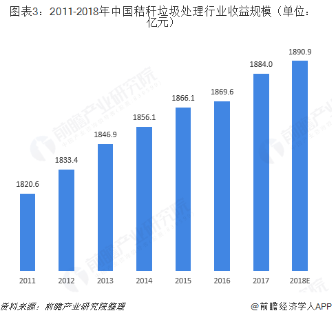 結(jié)合上述收益水平以及國家政府的大力補(bǔ)貼,2017年,秸稈垃圾處理行業(yè)收益規(guī)模達(dá)到1884.0億元,同比增長0.8%,行業(yè)收益率達(dá)到56.8%;預(yù)計到2018年,行業(yè)收益規(guī)模有望繼續(xù)增長至1890.9億元。