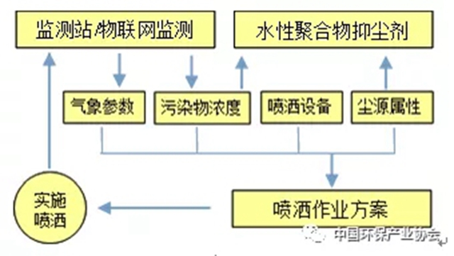 以環(huán)境空氣質(zhì)量監(jiān)測數(shù)據(jù)為依據(jù)、水性聚合物抑塵劑為主體、智慧化噴灑作業(yè)為實施方式,提高堆場和城區(qū)揚塵治理的有效性。根據(jù)PM2.5、PM10實時監(jiān)測結果及其變化趨勢,確定水性聚合物抑塵劑的用量和噴灑頻次,根據(jù)塵源屬性確定抑塵劑的品種,根據(jù)實時氣象參數(shù)、塵源狀態(tài)以及周邊環(huán)境狀況制定并實施噴灑作業(yè)方案。