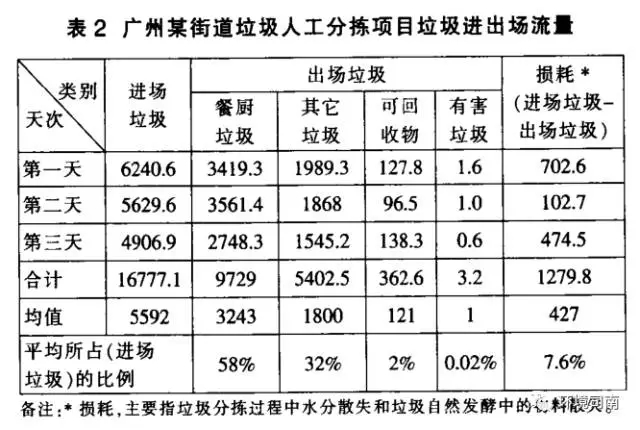 根據(jù)多年的垃圾調(diào)查實(shí)踐,并連續(xù)三天對(duì)廣州某街道垃圾人工分揀項(xiàng)目的調(diào)查,在每天平均3人工作7小時(shí)、在垃圾分揀平臺(tái)(平臺(tái)設(shè)置濾水、通風(fēng)除臭)上,主要將生活垃圾分為餐廚垃圾和其它垃圾兩大類,并揀出其中少量的塑料瓶和玻璃,分揀垃圾量和各類垃圾成分結(jié)果如表2所示。