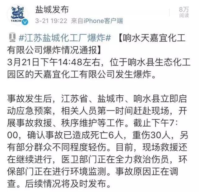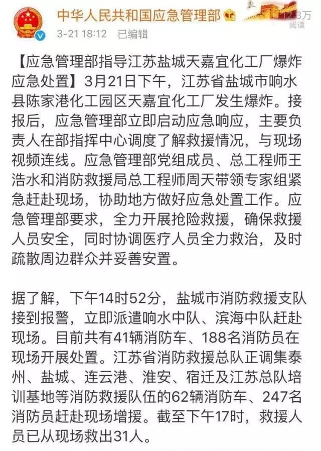 事故發(fā)生后,江蘇省、鹽城市、響水縣立即啟動(dòng)應(yīng)急預(yù)案,相關(guān)人員第一時(shí)間趕赴現(xiàn)場(chǎng),開展事故救援、秩序維護(hù)等工作。截至3月21日下午7:00,確認(rèn)事故已造成死亡6人,重傷30人,另有部分群眾不同程度輕傷。目前,現(xiàn)場(chǎng)救援還在繼續(xù)進(jìn)行,醫(yī)衛(wèi)部門正在全力救治傷員,環(huán)保部門正在進(jìn)行環(huán)境監(jiān)測(cè)。事故原因正在調(diào)查。后續(xù)情況將及時(shí)發(fā)布。