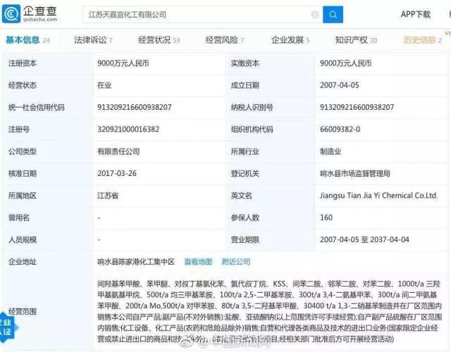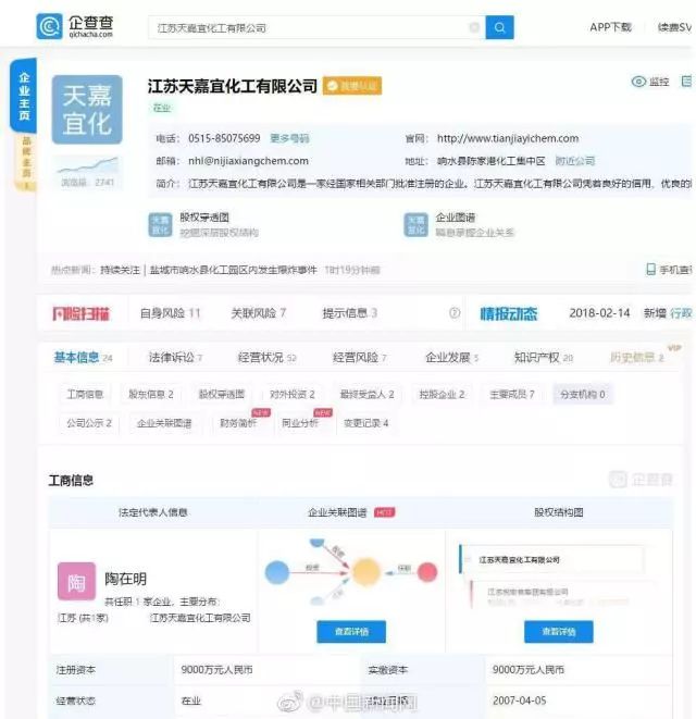 企查查數(shù)據(jù)顯示:江蘇天嘉宜化工有限公司成立于2007年,陶在明任法定代表人,注冊(cè)資本9000萬(wàn)人民幣,經(jīng)營(yíng)范圍包括間羥基苯甲酸、苯甲醚、KSS等精細(xì)化工產(chǎn)品制造、化工產(chǎn)品銷售等業(yè)務(wù)。