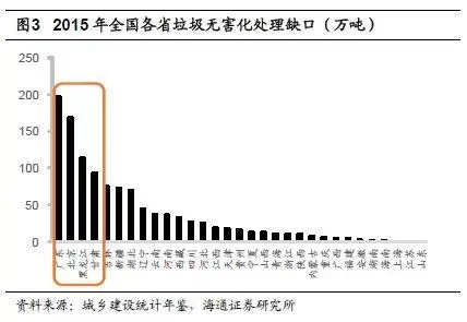 城鎮(zhèn)垃圾無(wú)害化處理缺口巨大。以人均垃圾產(chǎn)生量1.2kg/日來(lái)計(jì)算,2015年我國(guó)城鎮(zhèn)垃圾生產(chǎn)總量為3.38億噸,而2015年我國(guó)垃圾清運(yùn)量為1.91億噸,對(duì)應(yīng)缺口巨大。另一方面,從清運(yùn)量看,2015年我國(guó)生活垃圾無(wú)害化處理量為1.8億噸,無(wú)害化處理率為94.1%,對(duì)應(yīng)全國(guó)無(wú)害化處理總?cè)笨跒?129萬(wàn)噸,分省區(qū)來(lái)看,缺口最大的有廣東(196萬(wàn)噸)、北京(168萬(wàn)噸)、黑龍江(114萬(wàn)噸)、甘肅(94萬(wàn)噸)。2006-2015年間,我國(guó)生活垃圾無(wú)害化處理缺口累計(jì)超過(guò)3.6億噸。
