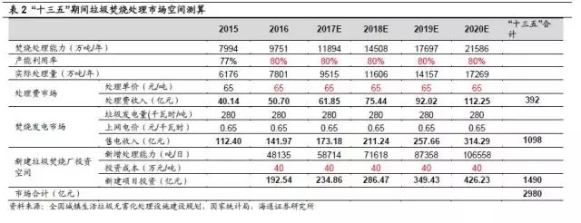 按照垃圾焚燒規(guī)劃新增處理能力對(duì)市場(chǎng)空間進(jìn)行測(cè)算,“十三五”期間垃圾焚燒處理費(fèi)市場(chǎng)空間總計(jì)近400億元,焚燒發(fā)電市場(chǎng)空間約1100億元,兩者合計(jì)運(yùn)營(yíng)收入約1500億元;此外,新增處理能力所需的建設(shè)投資總計(jì)近1500億元,垃圾焚燒市場(chǎng)空間巨大。